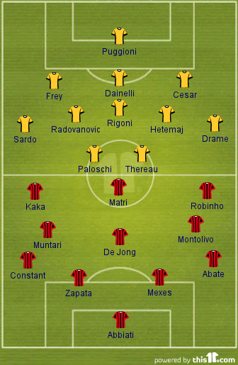 Probable Starting Lineup [4-3-3]: Abbiati; Abate, Mexes, Zapata, Constant; Montolivo, De Jong, Muntari; Robinho, Matri, Kaka