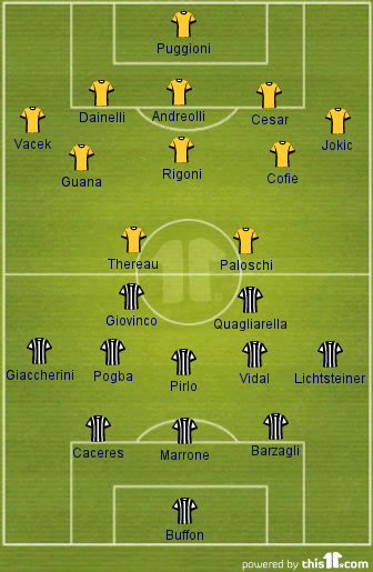 Probable Starting Line-up (3-5-2):Ai??Buffon; Caceres, Marrone,Ai??Barzagli; Giaccherini,Ai??Pogba, Pirlo, Vidal, Lichsteiner; Giovinco, Quagliarella