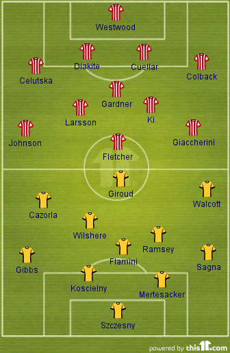Probable Starting Line-UpAi??[4-2-3-1]: Szczesny [GK];Ai??Sagna, Koscielny, Mertesacker, Gibbs; Ramsey, Wilshere; Walcott, Ozil, Cazorla; Giroud