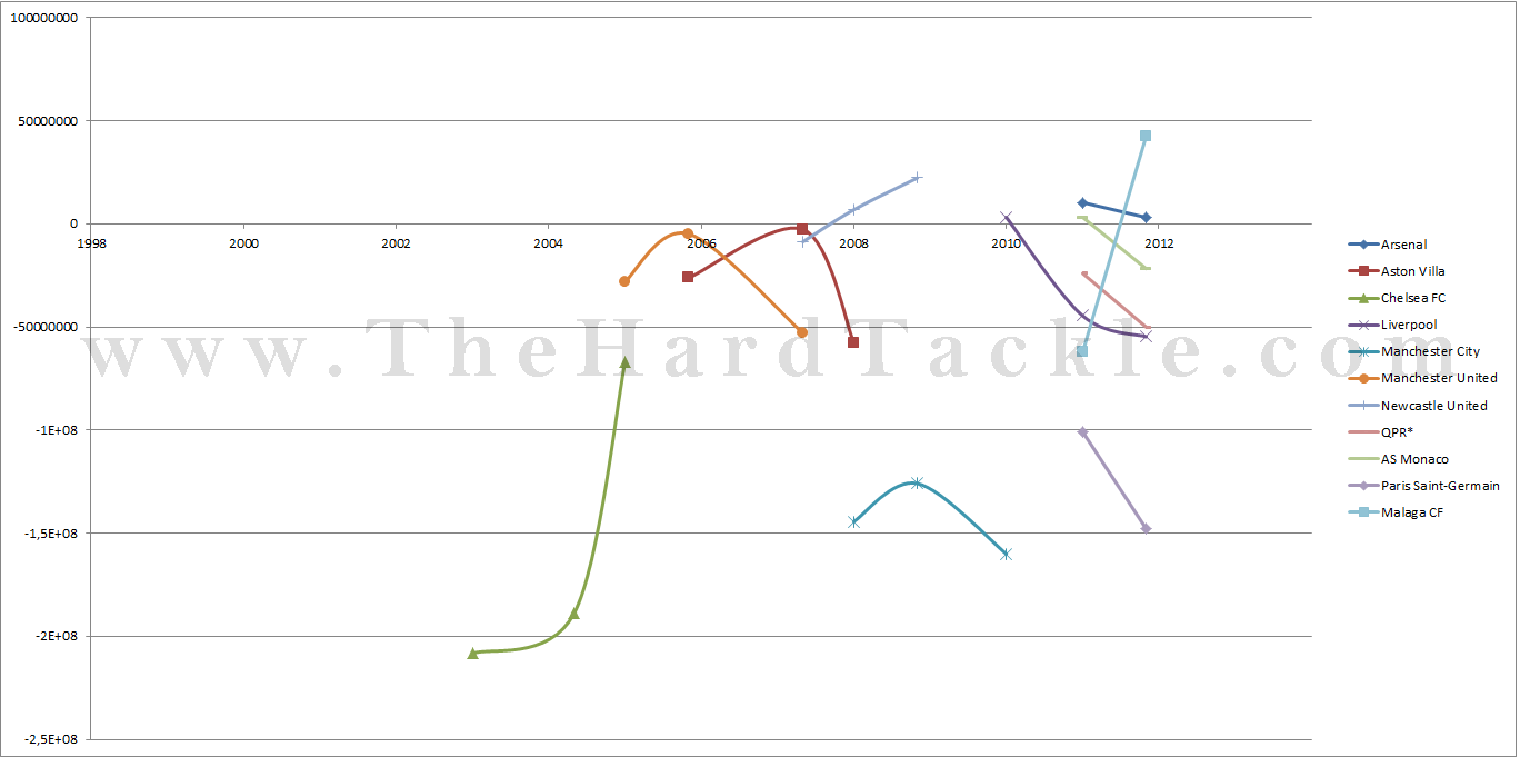 Chelsea FC had an annual net expenditure (revenue from sales minus outlay) of ai??i??17,1 million, Manchester United averaged ai??i??36,8 million, Aston Villa spent ai??i??9,6 million, Newcastle United ai??i??23 million, Manchester City ai??i??17 million, Liverpool ai??i??24,2 million, QPR ai??i??2,5 million, PSG ai??i??6,3 million and Malaga CF ai??i??13,8 million.