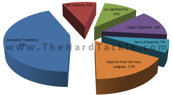 A further 40% (12 players) from the various top 10ai??i??s are made up of continental transfers in between Ai??Europeai??i??s top 5 leagues (Bundesliga, EPL, Serie A, La Liga, Ligue 1), while the rest 17% (5 players) hail from Portugalai??i??s Primeira Division (4) and only 1 from outside of Europe (Argentinaai??i??s Primera Division).