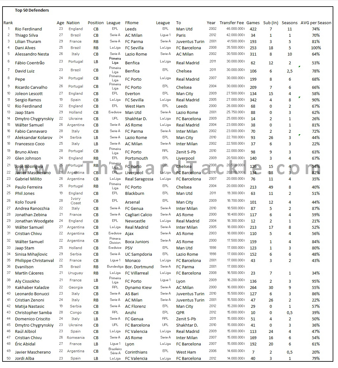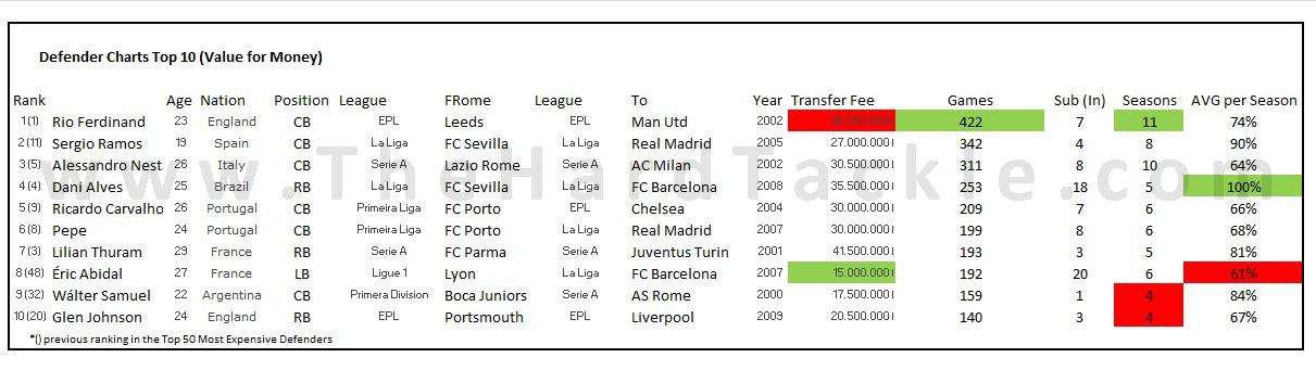 Surprisingly Barcelonaai??i??s Eric Abidal also makes the list. Signed for ai??i??15 million in 2007 (ai??i??16,9 million adjusted for inflation), the Frenchman is the cheapest transfers on the list (nominally). Considering that he effectively missed 1,5 seasons, his appearance record of 61% must be viewed in some context. Had it not for his terrible disease heai??i??d probably rank much higher than no. 8, which is not too bad at all.