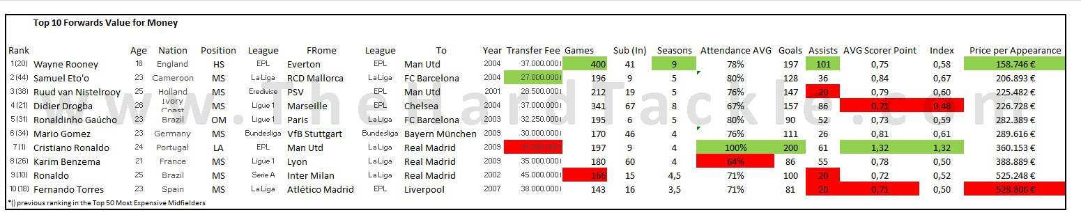 Wayne Rooney, at ai??i??37 million (ai??i??44 million adjusted for inflation), would have to be the single greatest forward acquisition inside the top 50 (forwards) of all-time. After 9 years of (ongoing) service he has cost Manchester United ai??i??158,000 per appearance thus far. This value further decreasing with every passing game. He also ranks first in games accumulated, seasons played and assists, all the while having an average scorer point of 0,75 ai??i?? indicating he is (almost) producing a goal (or an assist) in every game.