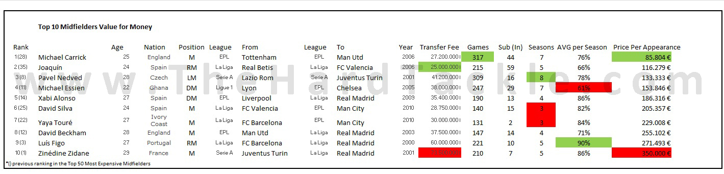 Surprisingly itai??i??s Michael Carrick who represents the best value among his peers. Ranked 28th on the money list (ai??i??27,2 million; ai??i??31,2 million adjusted for inflation), he ranks first in games played (317) and, more crucially, price per appearance (ai??i??85,804). He also ranks okay in the appearance record category (67%), which is not too bad, considering squad rotation and injuries amongst other things.