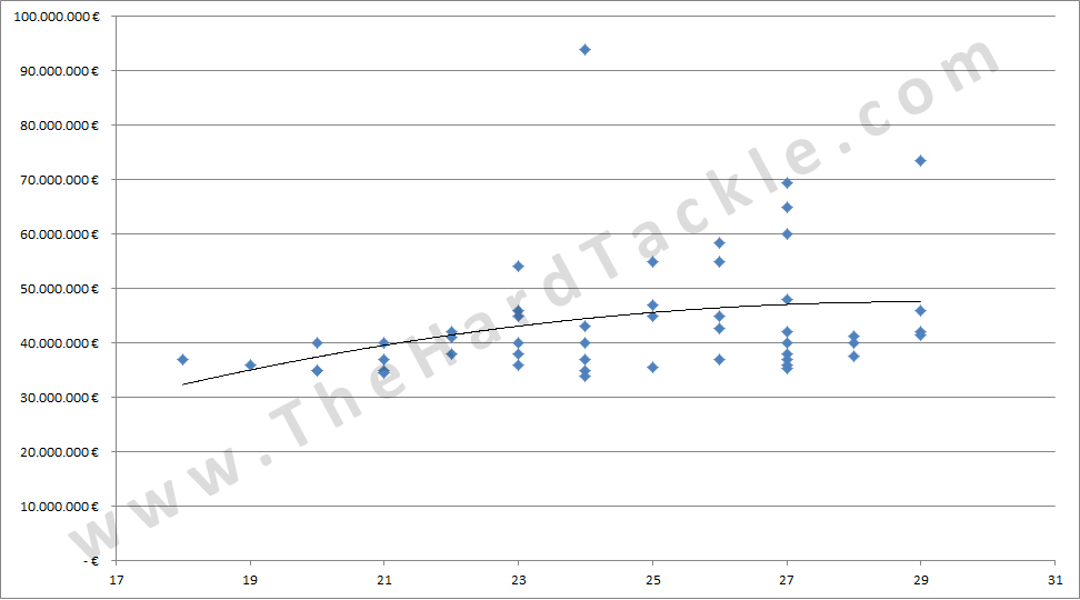 The majority of big money transfers (82%) involve players who are 24 years old on average and command a fee between ai??i??30 ai??i?? 50 million. Itai??i??s a pretty good indicator that most clubs favor players who are yet to enter their peak, with resell value. Under optimum conditions signing a player at the upper end of the scale, at 25, would still guarantee the buying club four years of service before either renewing the contract when they turn 29, or opting to sell.