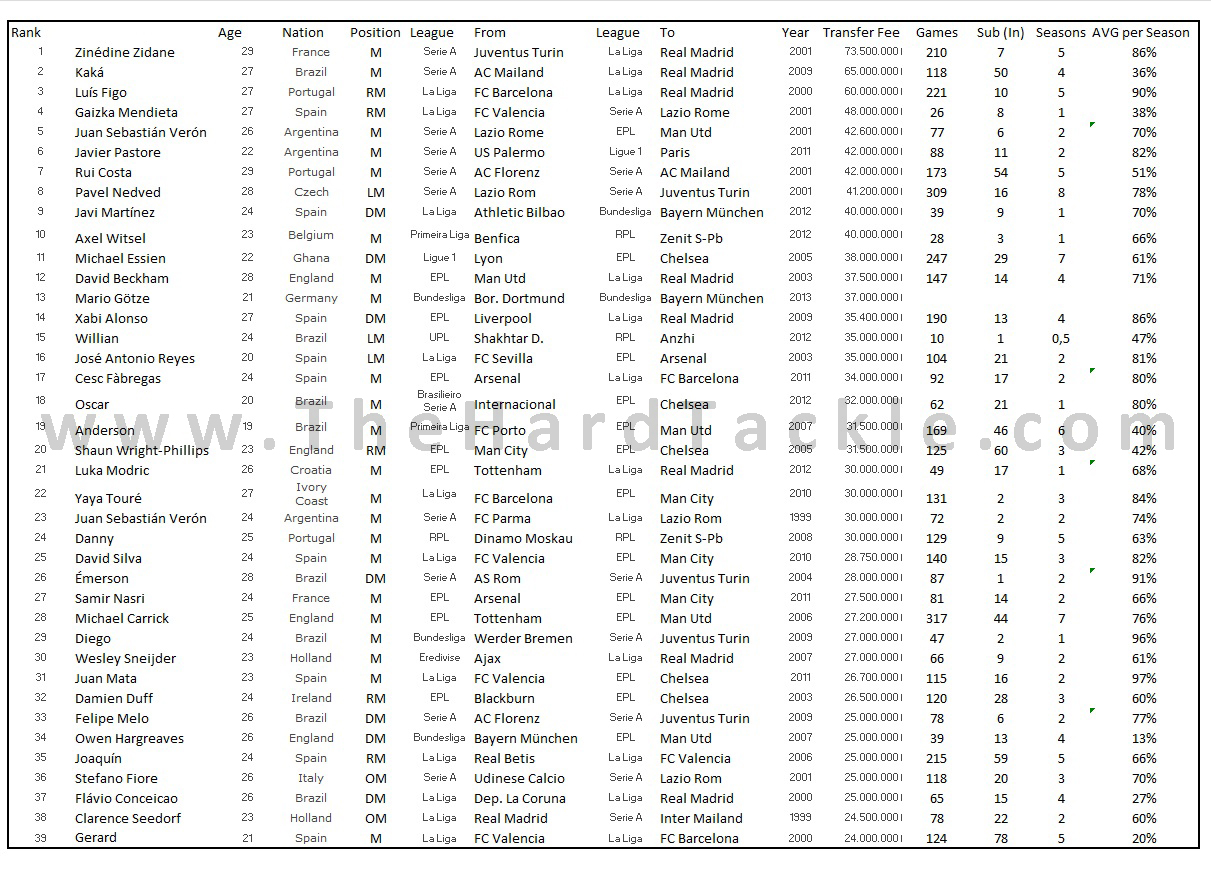 Ever since the landmark Bosman ruling in 1995 transfers fees for players have escalated to obscene levels. Whereas any transfer in excess of ai??i??10 million wouldai??i??ve caused a public outcry whether or not such an outlay was justified in 1995, itai??i??s hardly worth mentioning in 2013. Big money transfers have become the norm, not the exception. To break into the top 50 transfers of all-time the fee has to exceed ai??i??35 million in total value.