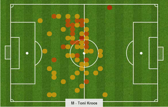 Bayern Munich midfielder Toni Kroos showed once again why he is considered among best attacking midfielders in the game currently. The 23-year-old ran the show for Germany in the midfield and ended the game with two wonderful assists. He made six key passes, had a pass success rate of 97% and 13 accurate long balls on this match. The above heat map shows his movement and positioning in the game against Ireland.