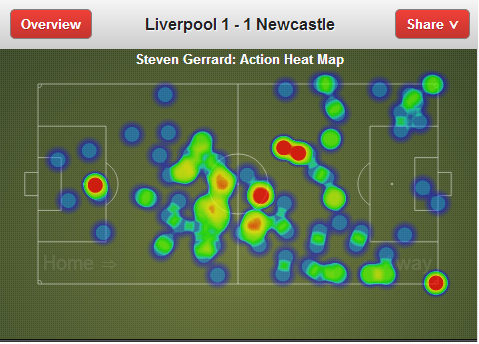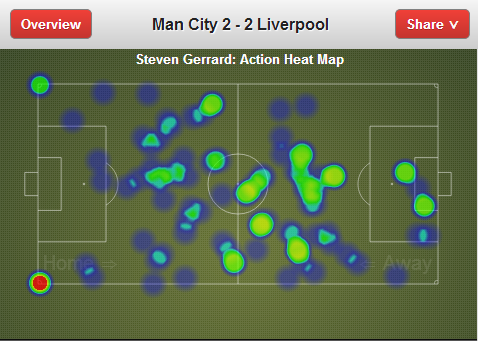 Liverpoolai??i??s last game against Manchester City saw Gerrard once again have a commanding influence on the side. Gerrard notched up another assist to reach his best ever tally of 10 in the League and also scored a goal which would be among the contenders for goal of the season. Gerrard controlled the strings from midfield and timed his runs into the opposition third with perfection. The captain had the highest number of passes of any player on the pitch and dictated the play against the English Champions. The heat map clearly reveals that Gerrard has been more intelligent in his positioning both in defence and attack. Gerrard has been getting into dangerous positions outside the opposition penalty area and hasnai??i??t drifted wide as much as earlier in the season.