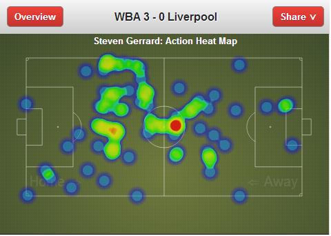 A quick look at the heat map in the 3-0 away defeat against West Brom at the start of the season reveals that Rodgers initially intended to play Gerrard in the No. 10 role behind Luis Suarez. Gerrard had his best season playing as an attacking midfielder under Rafa Benitez. Playing just off Torres, Gerrard was able to quickly pick through balls which allowed the Spaniard to run in behind the defence. The space left by defenders tracking Torres allowed Gerrard to push forward and get into goal scoring positions himself.