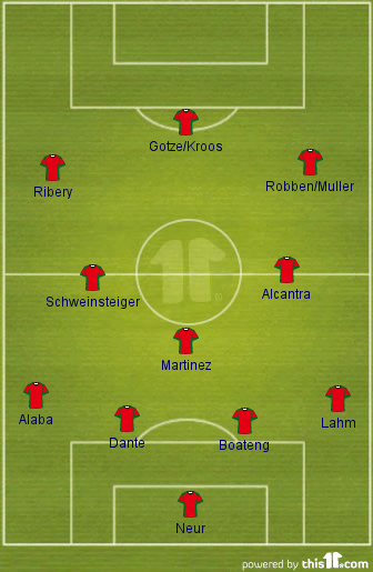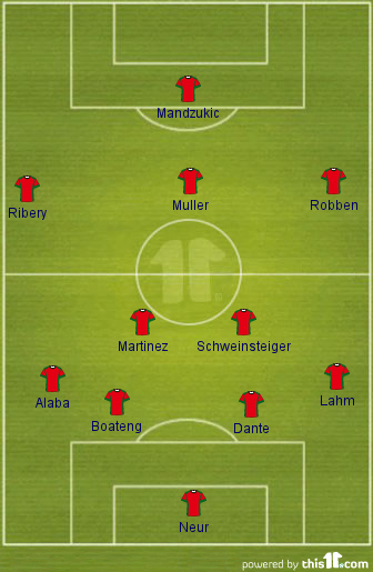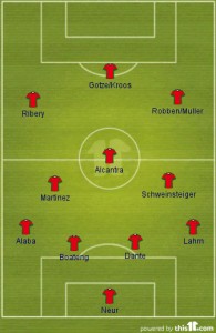 For the most of last season Bayern utilized a 4-2-3-1 formation under Jupp Heynckes and it delivered great results. Bayern more often shaped up with a solid central defence pair in Alaba and Boateng (Van Buyten), Lahm and Alaba occupying the right and left fullback, double pivot in midfield with Martinez and Schweinstieger, Robben, Muller and Ribery in the attacking third and lone striker upfront in Mandzukic(Gomez). See image below: