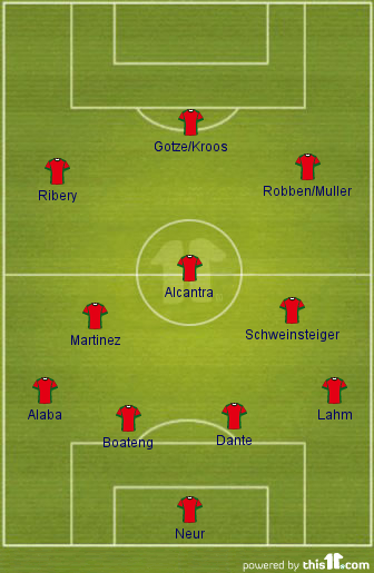 Guardiola will surely shuffle that and use a 4-3-3 formation with a false nine. Understanding that the prime reason Alcantara left Barcelona was first team football, Guardiola would make him start/play most games. That makes Gotze as the most preferable choice for a false nine with maybe an option in Kroos or occasionally Robben (given his ability and tendency to shift to the centre). While Guardiola has wowed one and all with his beautiful game, he has also drawn flak for fielding a weak defence. Bayern on the other hand pride themselves for their rock solid defence and last season was no different. So in all probability Guardiola would not change the defenders and the holding midfielders. That makes only four slots available upfront and Guardiola has to choose from the likes of Muller, Kroos, Gotze, Ribery, Robben, Mandzukic, Shaqiri and Alcantara. Now to ensure Thiago gets optimum starts and play time the two possible 4-3-3 formations that Guardiola could deploy are depicted in the images below.