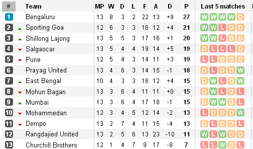 The upset of the round was sponsored by Rangdajied United. The Meghalaya side sensationally got the better of high flying Pune FC at home courtesy two very late goals to complete a terrific comeback. Santosh Kashyapai??i??s side is now only two points adrift of safety in the table and it would be no surprise that the Meghalaya side eventually end up floating around mid table post some round of matches. Rangdajied has now only lost one in their last five, thanks to some shrewd signings by the team, adding teeth to all the departments. Pune FC on the other hand lost the chance to stay hot on the heels of league leaders Bengaluru FC, as they won their away match in style. The Red Lizards will now be slotted in the fifth spot, with no wins in their last five encounters.