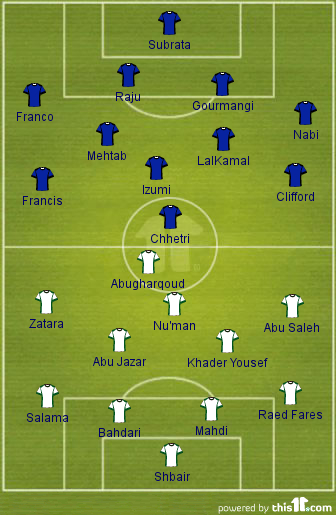 In absence of first choice goalkeeperAi??Ramzi Saleh,Ai??Mohammed Shbair looks likely to start the game withAi??Tawfiq Ali on the bench.Ai??Abdel-Latif Bahdari who plies his trade in Saudi-Arabia, will start in theAi??centerAi??of defense accompanied byAi??Khaled Mahdi. BothAi??Bahdari andAi??Mahdi are over 6 feet tall and will look to keep Chhetri under check.Ai??Raed Fares, after a solid showing in the WAFF Championship is likely to start as the right-fullback and either ofAi??Ahmad Salama or Nadim Barghouti will start on the left flank.