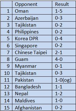 An important point that emerges from these results isAi??India’s lack of ability to score goals and this was evident even in the recently concluded SAFF Championship where team India scored just three goals in five matches. The last time India scored in an away match against teams ranked above it was at the start of 2012 when Oman beat India 5-1. In last fifteen matches played away from home, team India has manged to score only 10 goals with four of them coming against Guam. What is more remarkable, in last ten away matches played against opposition ranked better than India, the team has scored just 2 goals.