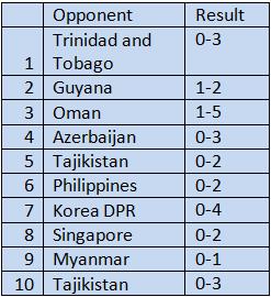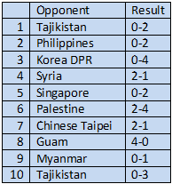 While India have dominated at the SAFF Championships, the team has struggled to perform against countries from outside SAFFAi??region and has lost against teams where they were expected to win. Ai??The table on the right shows India’s results in last 10 matches against non SAFF opponents. India managed to win only three of theAi??ten matches, two of which came against Guam (FIFA Ranking 175) and Chinese Taipei (FIFA Ranking 176) in AFC Challenge Cup qualifiers and the third win came against Syria at home in the Nehru Cup. The performance in AFC Challenge Cup qualifiers was far from satisfactory as favorites India failed to get past the host Myanmar in the last match. After the Nehru Cup triumph, things have not gone as per plan for Koevermans and going by this record the friendly against Philippines might prove to be a tough as the Azkals boast of several European based players in the team. AAi??common point in all these losses has been the lack of concentration which has seen team India concede some silly goals.