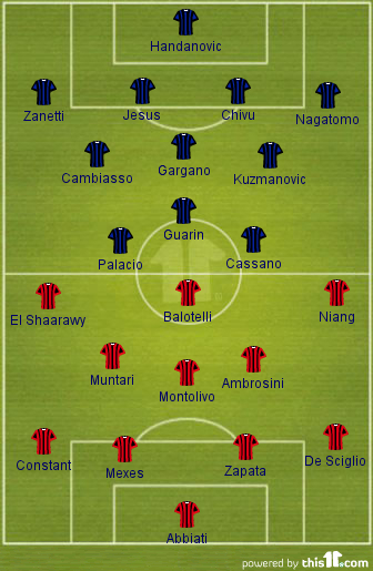 The Mohawk trident should be back in place for the derby and all eyes will be on Mario Balotelli. Being cup-tied for the Barcelona fixture, Balotelli is well rested and will be keen to leave a mark against his former employers. Chivuai??i??s inclusion in Interai??i??s defense will leave Balotelliai??i??s mouth watering and the Italian international will look to take full advantage of this flaw in Interai??i??s defense. Stephan El Shaarawy will keep his spot on the left side of attack and will be up against the workaholic, Javier Zanetti. The Ai??20-year-old will not have things as easy as he might have liked but his immense energy could just outdo Zanetti for the first time in his double decade long career. Mai??i??Baye Niang or Bojan might replace Kevin-Prince Boateng on the right side and this will be an extremely important position for Milan. Given Nagatomoai??i??s poor showings this season, Milanai??i??s right attacker could be their best creative outlet and this leaves Niang as the better choice for Max Allegri.