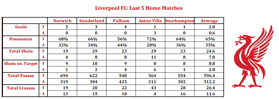 The statistics from the last 5 home matches clearly shows the extent of domination that the Merseyside club has enjoyed in recent weeks at Anfield. Liverpool average 65% possession and score nearly 3 goals per game. Brendan Rodgers’ side has also managed to average nearly 600 passes per game and have 25 shots on goal every match.