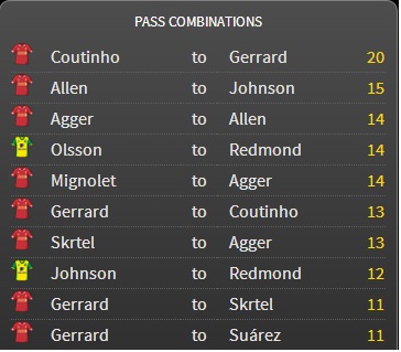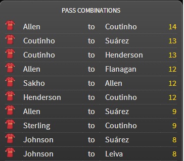 With Sturridge injured, Rodgers has reverted to a 4-2-3-1 with Coutinho as the number 10 and Suarez leading the line. And it has reaped great rewards, with Liverpool scoring 9 goals in 2 games. It is noteworthy that in these two matches, Coutinho has been part of the most frequent pass combinations. He passed to Stevie Gerrard 20 times against Norwich, well above the runner up combination of Joe Allen passing to Glen Johnson 15 times. Against Norwich, Coutinho is actually part of all of the top three passing combinations. Compare this with the game against Hull City (where Coutinho only came on in the second half), where the top 4 combinations were between the back line and the goalkeeper.