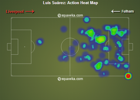 Luis Suarez put up a wonderful performance for Liverpool upfront. The Uruguayan international has been in sensational form since his return from suspension and has already scored eight goals in just six league appearances. Both of his goals came from his wonderful movement in behind the defence and calm and composed finished at the end of it. He had a glorious opportunity to score another in the second half, but missed it from close range. The above heat-map depicts his movement and positioning on the pitch against Fulham.