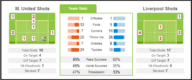 Liverpool dominated possession especially in the later stages of the match, though they failed to break through the United defence. What was also apparent was that both the sides attacked mostly through their right wings.