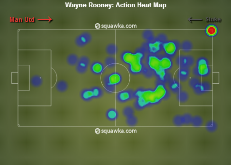 Wayne RooneyAi??has undoubtedly been Manchester United most consistent player this season and was one again pivotal in helping United claw their way back into this game. He assisted the first goal with a good header towards Robin van Persie and scored with a wonderful glancing header to equalize for the home side. Moreover, nearly everything in attack went through him. The above heat map depicts his movement and positioning on the pitch against Stoke.