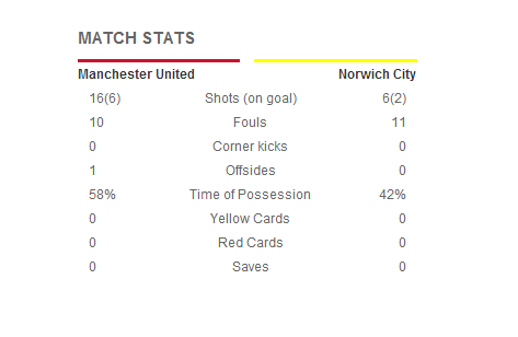 Both teams went into the tunnel at half time with United leading 1-0 thanks to a Robin van Persie goal. After the break Norwich started the game off brightly, as Johan Elmander flicked a cross from Nathan Redmond over the crossbar. And in the 52nd minute, United scored their and Javier Hernandezai??i??s second goal as left back Alexander Buttnerai??i??scross was headed to goal by Hernandez. Although his initial shot was saved, Hernandez followed up to head in the rebound.