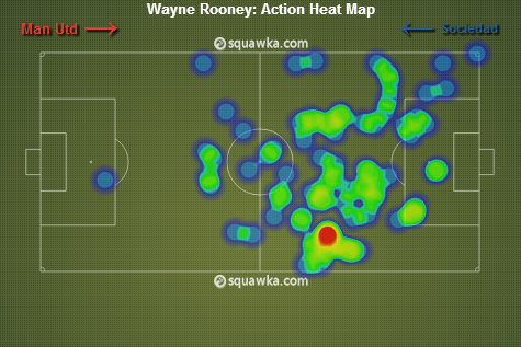 Wayne Rooney put up a fantastic display upfront for Manchester United. The Englishman has undoubtedly been United’s best player so far this season and he created the opening goal with his ability to take on players. The above heat-map depicts his movement and positioning on the pitch against Real Sociedad.
