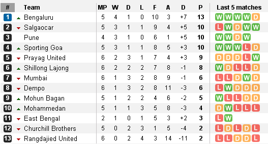 Dempo Sports Club after an impressive win over East Bengal were expected to continue their form. They were up against new boys in the league Bengaluru Football Club. The Bengaluru based side not only defeated Dempo but humiliatedAi??them by beating them 3-1. The star studded side of Dempo was grounded. Youngster Siam Hangal opened the scoring with scorcher from outside the box. Sean Rooney continued his good form by scoring brace in the drubbing. Clifford Miranda got a consolation goal for Golden Eagles. Bengaluru Football Club after this win have consolidated their position at the top and have remained unbeaten in the league so far.