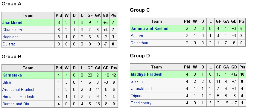 Group D which was also considered as a group of death did not live up to its expectation. With powerhouses such as West Bengal, Punjab, Karnataka and Manipur in the group it was predicted to be a close affair. A dominant display by the Punjab ensured that they become clear winner of this group winning all three matches of the group.