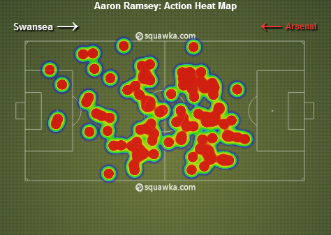 Aaron Ramsey was once again brilliant for Arsenal in midfield as he finished the game with one assist and one goal. The Welsh midfielder has been in excellent goal scoring form his season and is also currently the player with the most number of successful tackles in the Premier League. The above heat map shows his movement in the match against Swansea.