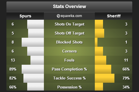 Tottenham maintained their 100% record in Europe this season as they against Sheriff at White Hart Lane last night. Spurs have confirmed their place in the next round with this victory, but would need to win against TromsA? to win this group. Meanwhile Sheriff are on the verge of being knocked out of the tournament; although mathematically they can still qualify, but they will need to win their next two matches and hope that Russian side Anzhi lose their last match against Spurs.