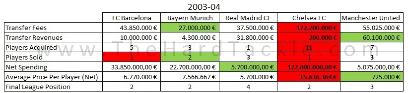 It was quite simply unprecedented and at that point in time unthinkable a club, let alone a single individual, would sanction a transfer spree of this magnitude. Chelsea FCai??i??s ai??i??172,2 million investment for 11 players in the 2003-04 is a 213% increase of Manchester Unitedai??i??s outlay of ai??i??55 million for 7 new signings. To further illustrate the sheer scale of the Blues acquisition spree, FC Barcelona, Bayern Munich, Real Madrid and Manchester United collectively purchased 16 players worth ai??i??163,4 million.