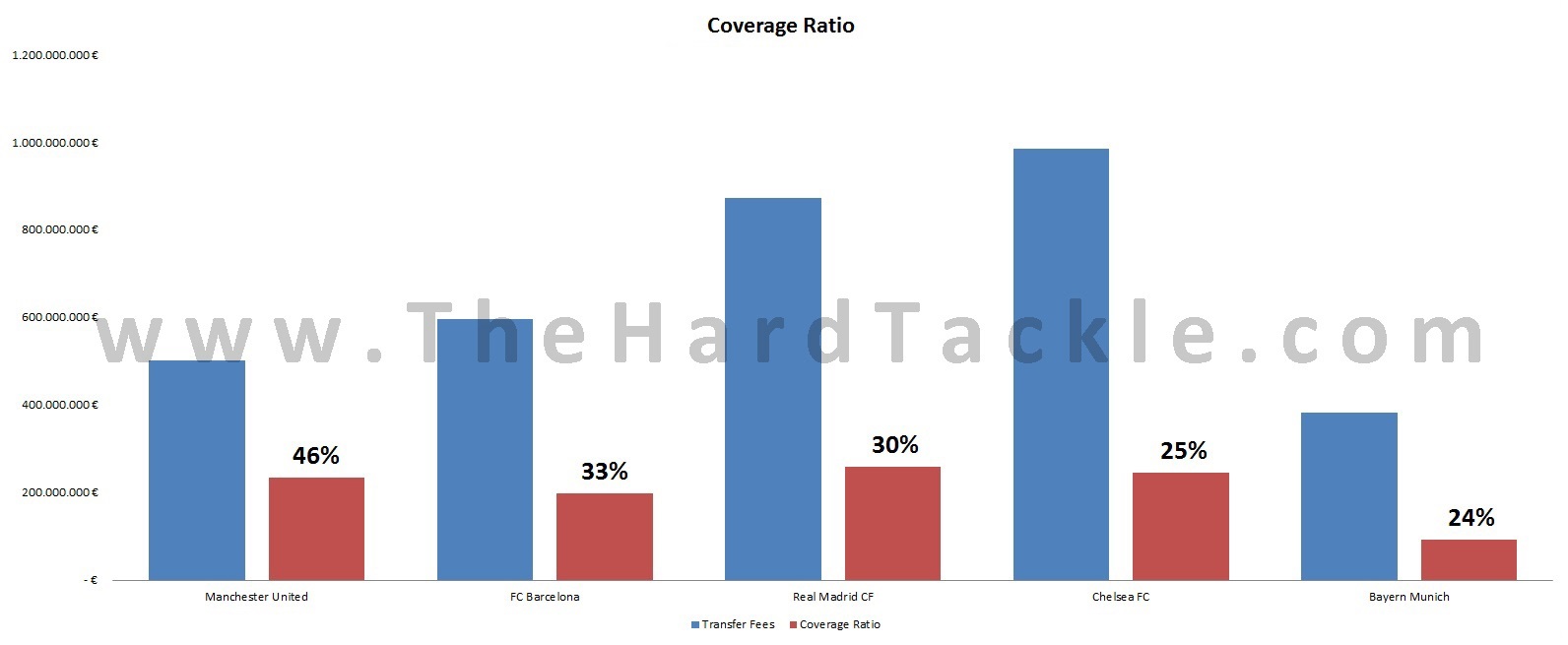 The coverage ratio itself only gives an information about the percentage of the net outlay a club has committed to acquire new players, not the exact total. Most clubs must design their transfers business to be self-sustaining, meaning player acquisitions must and should be funded through sales. Big clubs however operate on a different business model (if that term is applicable). As far as recruitment is concerned the transfer policy of a big club is basically constructed around a deficit.