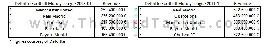 In 2003 Manchester United, Real Madrid and Chelsea FC were among the top 5 clubs in terms of revenue, while FC Barcelona and Bayern Munich were ranked at the lower end of the top 10.