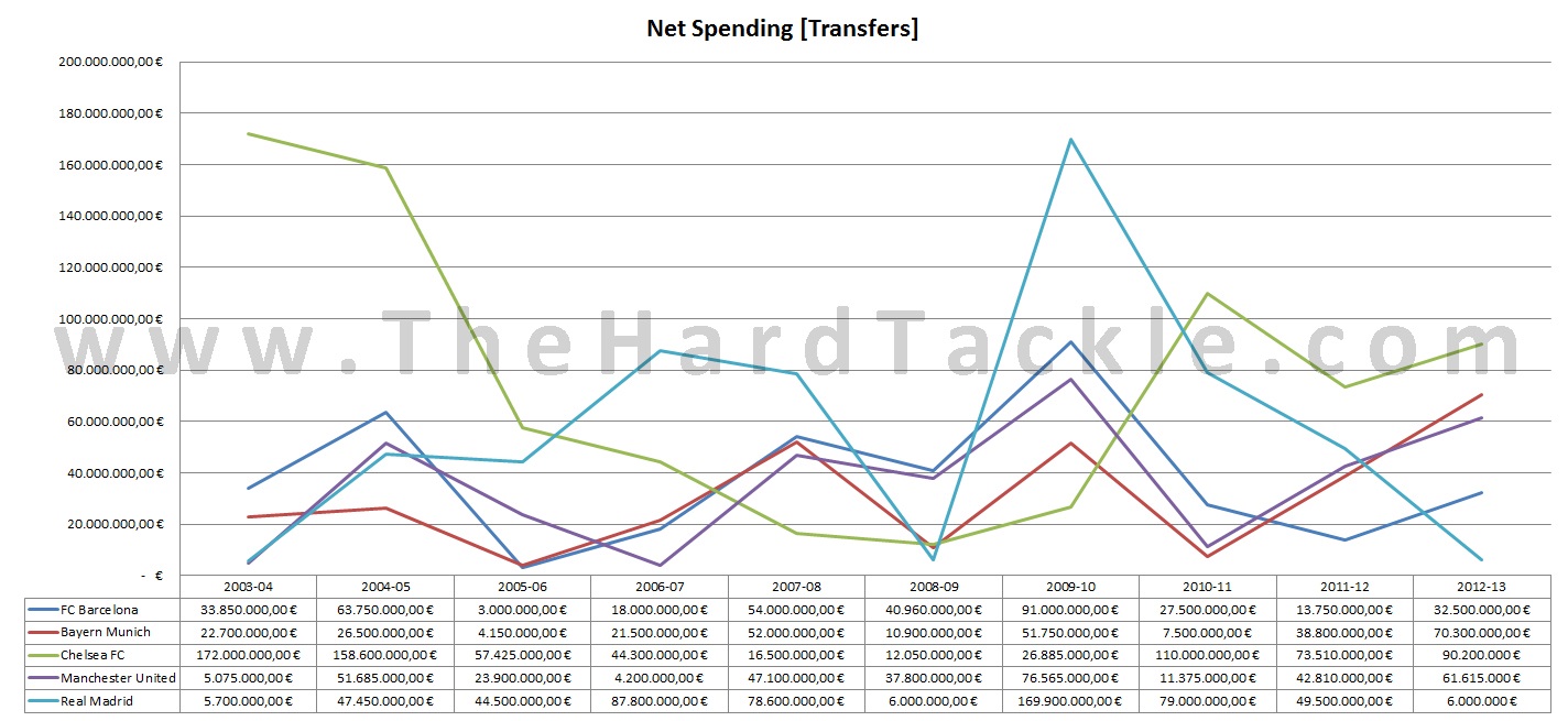 Itai??i??s quite an interesting revelation since itai??i??s usually Chelsea FC that is accused of buying success. A direct comparison between Chelsea FC and Real Madrid is not helpful. Thus it would probably be wiser to further scrutinize their investments in conjunction with their two primary domestic rivals (FC Barcelona and Manchester United) since these teams have similar outlays.