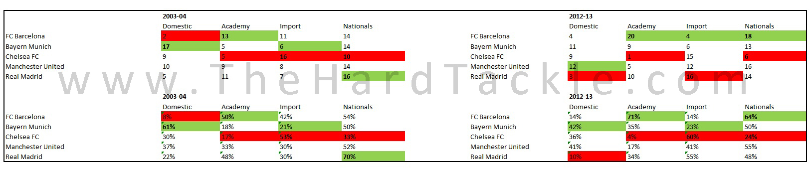 Even for all their Galatico shenanigans Real Madrid have always maintained a strong Spanish core. Even though it has fallen well below the benchmark set in 2003-04 of 70%, or 16 players, the 2012-13 Merengues still have 14 players (48%) that are Spanish. The percentage of academy players has significantly regressed from 48% to 34% but thatai??i??s the logical tradeoff if the annual superstar signing has become pre-requisite.