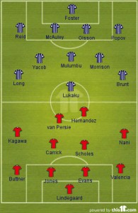 Clarke has tried his hand at a number of different formations in recent weeks and it is hard to predict what he will have in locker for Sundayai??i??s game. Given the Baggies are up against the might of Manchester United, the sensible option might be to play an extra man in centre of midfield in a 4-3-3 setup. Former United goalkeeper Ben Foster committed an absolute howler against Norwich last weekend but will still be favourite to start in goal. Gareth McAuley, whose own goal set United on their way to a 2-0 win in the reverse fixture, and Jonas Olsson are the first choice centre back pairing while Goran Popov and Steven Reid, fitness permitting, will start at full back positions. In midfield, both Claudio Yacob and Youssouf Mulumbu have been impressive this season and will like to end the season on a high by putting in a commanding display against the champions. Should Clarke opt for a 3 man central midfield, James Morrison should be in line for a start. Romelu Lukaku, who has been arguably West Bromai??i??s player of the season, will lead the line with Shane Long and possibly, Chris Brunt on the flanks.