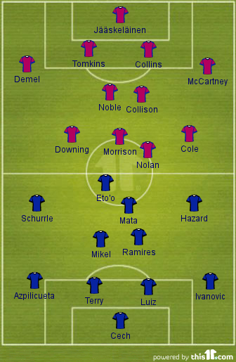Probable Starting Line-up (4-2-3-1):Ai??JAi??Ai??skelAi??inen;Ai??Demel, Tomkins, Collins, McCartney; Collison, Noble; Cole, Downing, Morrison; Nolan