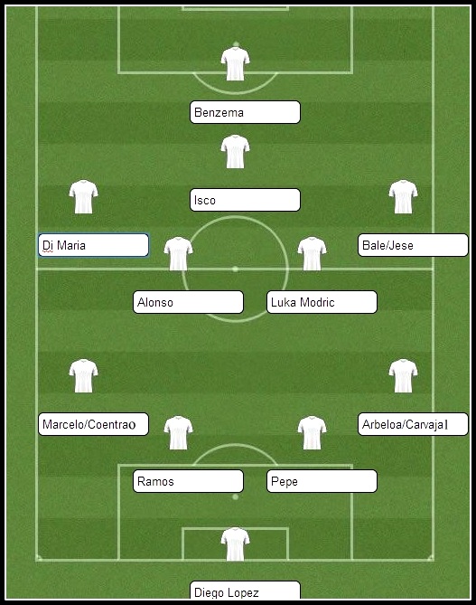 Meanwhile according to reports, Bale is training well and will be available for the match on Saturday. Nevertheless, it is not certain that the Italian manager would expose the Welshman to full 90 minutes on his first appearance after the recovery. Ai??In case Bale makes it to the starting-eleven, Ancelotti is most likely to deploy the winger on the right with Jese chipping in on the left. Both the wingers have shown themselves capable of playing on either side of the pitch and will be seen switching flanks in order to shake off defenders. In this case, Ancelotti will play the same midfield formation with Xabi Alonso and Modric playing in Central midfield and Di Maria positioned slightly upfront.
