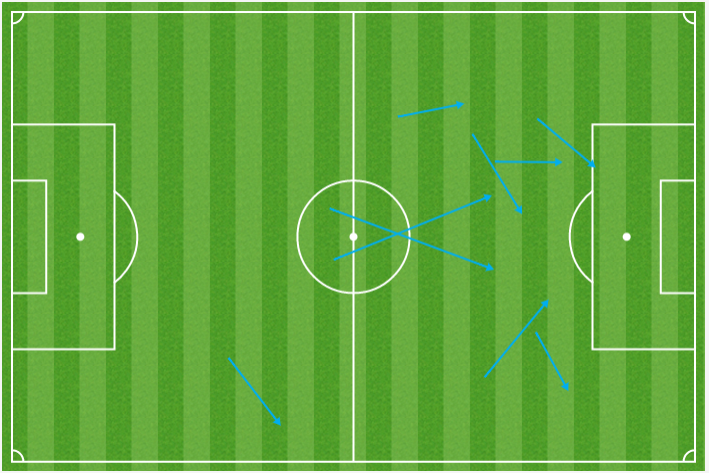 Olivier Giroud probably is just the wrong kind of striker to play aside Mesut Ozil. Don’t get it wrong, Giroud tries very hard to impress and as far as work rate is concerned is A-rate. His link up play is also up there with the best strikers in the league but again what he needs is players to run past him, players that can use him as a decoy and that is the missing chunk. For players like Ozil and Cazorla to function to their fullest, the striker should preferably make runs into the box playing at the shoulder of the defenders. The graphic below shows Cazorla and Ozil’s passes made to Giroud in the 2-0 win over Palace. Look at where Giroud recieves those passes, and how none of them are inside the box.