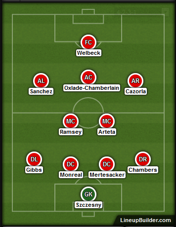 Predicted Line-up (4-2-3-1) ai??i?? Szczesny; Chambers, Mertesacker, Monreal, Gibbs; Arteta, Ramsey; Cazorla, Oxlade-Chamberlain, Sanchez; Welbeck