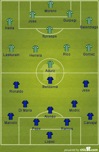 Expected line-up (4-3-3): Lopez; Carvajal, Ramos, Pepe, Marcelo; Modric, Alonso, Di Maria; Jese, Benzema, Ronaldo;
