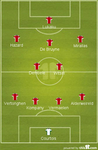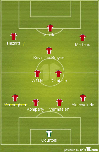 conventional 4-3-3 with Kevin De Bruyne (the hero of the qualifying rounds) starting in midfield alongside Axel Witsel and Moussa Dembele or Steven Defour. As a conservative, Fellaini could slot in an advanced role ahead of Witsel and Dembele. Given their full-back problems, the likes of Hazard and Mertens may well have to put in a shift defensively. In terms of spearheading the attack, Romelu Lukaku is expected to start as a conventional 9 instead of Kevin Mirallas in a False 9. However, there remains room for experimentation given the relatively easier nature of group the Belgians have at hand.