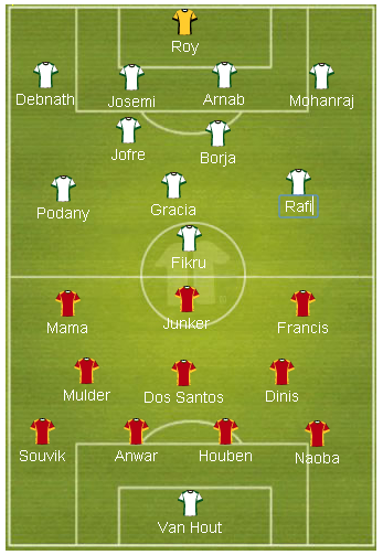 Probable Starting XIAi??(4-3-3):Ai??Van Hout(GK), Naoba, Anwar Ali, Houben, Souvik Ghosh, Hans Mulder(c), Junker, Bruno, Shylo Malswamtulunga, Francis, Dos Santos.