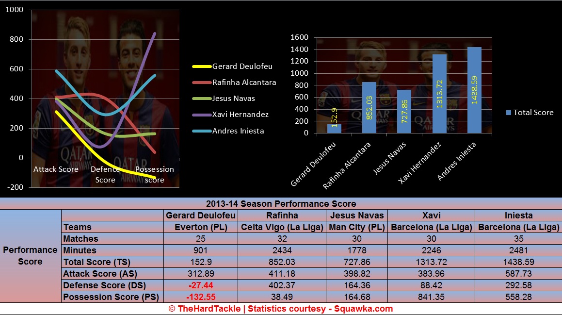 Even in duels, Rafinha is way above the others. With 59 tackles won, Rafinha offers lot more steel and vigor to the Barcelona line-up. While Xavi, who usually controls the tempo from deep has won only 18, Iniesta who plays a bit more advanced won 36, Navas in his first season in England won 28 and Deulofeu struggled to even make it to double figures. Rafinhaai??i??s inclusion in the line-up will not only offer more protection to counter-attacks but also give Barcelona little more possession to their already impressive numbers.
