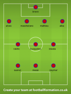 Predicted Starting XI: Bravo; Alves, Mascherano, Mathieu, Alba; Rakitic, Busquetes, Iniesta; Suarez, Messi, Neymar.