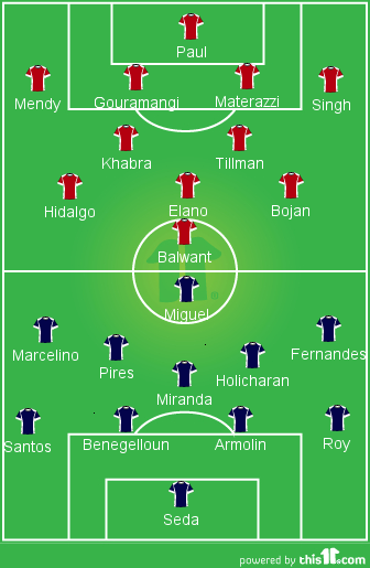 Chennaiyin FC Probable XI:Ai??Shilton Paul,Ai??Bernard Mendy,Ai??Gouramangi Singh,Ai??Marco Materazzi,Ai??Dhanachandra Singh,Ai??Harmanjot Khabra,Ai??Pierre Tillman,Ai??Cristian Hidalgo, Elano,Ai??Bojan Djordjic, Balwant Singh