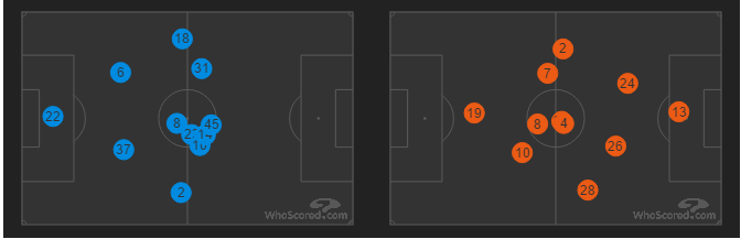 The ineffectiveness of Mario Balotelli as a lone striker can be seen in the graphic above (Number 45). The Italian had no time on the ball and cut a sorry figure after being constantly harried by Matic, Ramires and Fabregas. The fullbacks and the likes of Can, Allen and Henderson tried to support the Italian by moving forward but the Reds were always vulnerable on the counter attack.