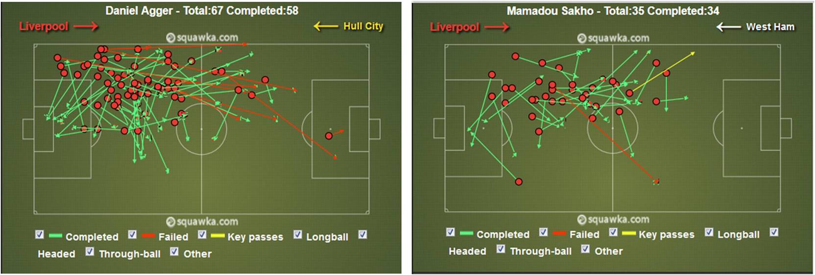 Shown below are passing graphs of Daniel Agger in the New Years’ Day Premier League fixture against Hull City (left, based on Agger’s highest rating via whoscored.com); and Mamadou Sakho at home against West Ham United (right, based on Sakho’s highest rating via whoscored.com).