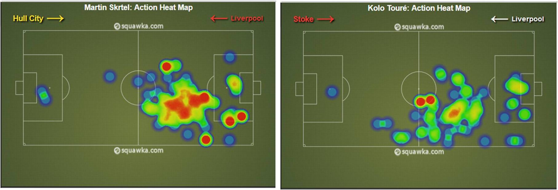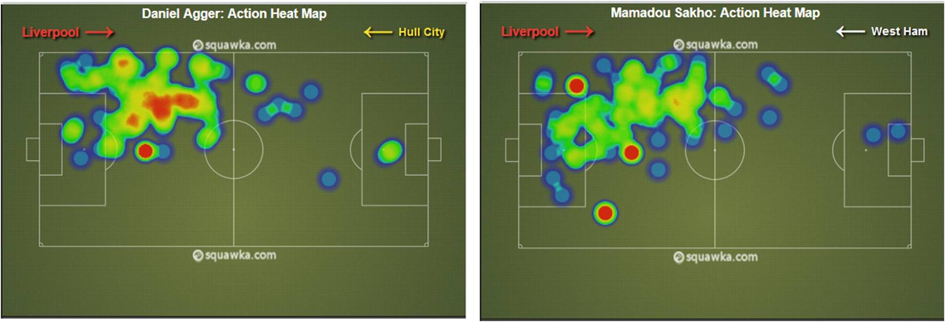 In ideal circumstances, if each centre half stuck to his job, an action heat map over the course of 90 minutes will look more like that of Daniel Agger’s against Hull City (left, based on Agger’s highest rating this season via whoscored.com) and less like Mamadou Sakho’s against West Ham (right, based on Sakho’s highest rating this season via whoscored.com). However, one must consider the fact that Liverpool’s dominance (in the literal sense of the word) provided Sakho with the opportunity to step forward more often.